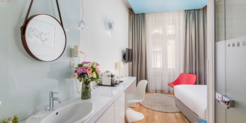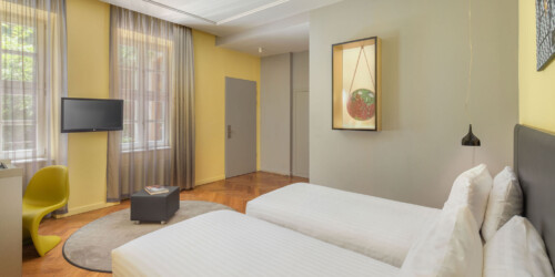 A minimál-stílusú, kortárs magyar művészek alkotásival díszített szobák légies, világos hangulata az ezüst és fehér szín finom kombinációjának köszönhető.