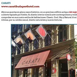 A Casati Hotel Budapest a korábban Pest Hotel néven működő (Bp. Paulay Ede 31.) szálloda átalakításával jött létre. A Pest Hotelt megvásárló új tulajdonos azzal keresett meg minket, hogy egy Bobo (bourgeois-boheme) hangulatú boutique hotelt szeretne, hangsúlyos budapesti feelinggel. A megcélzott utazóközönséget valahogy így definiálta: középkorú, világlátott, fizetőképes, de nem luxus igényű, a meglepetésekre és...