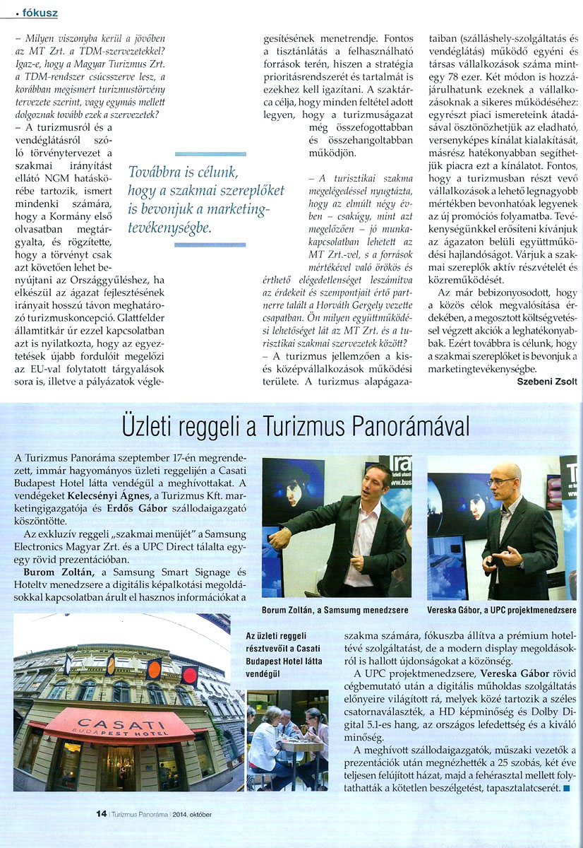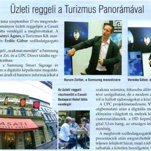 A Turizmus Panoráma szeptember 17-én megrendezett, immár hagyományos üzleti reggelijén a Casati Budapest Hotel látta vendégül a meghívottakat. A vendégeket Kelecsenyi Ágnes, a Turizmus Kft. marketingigazgatója és Erdős Gábor köszöntötte.